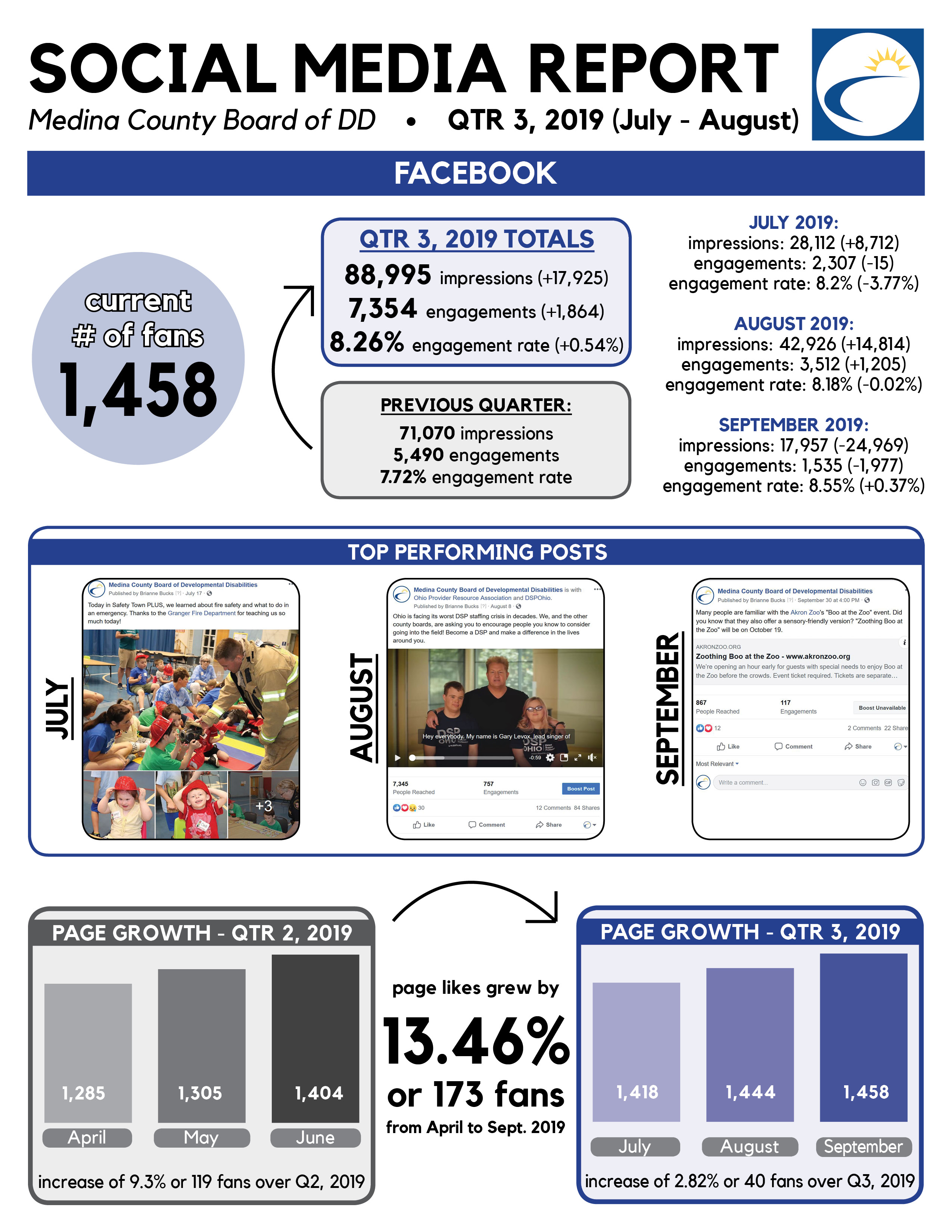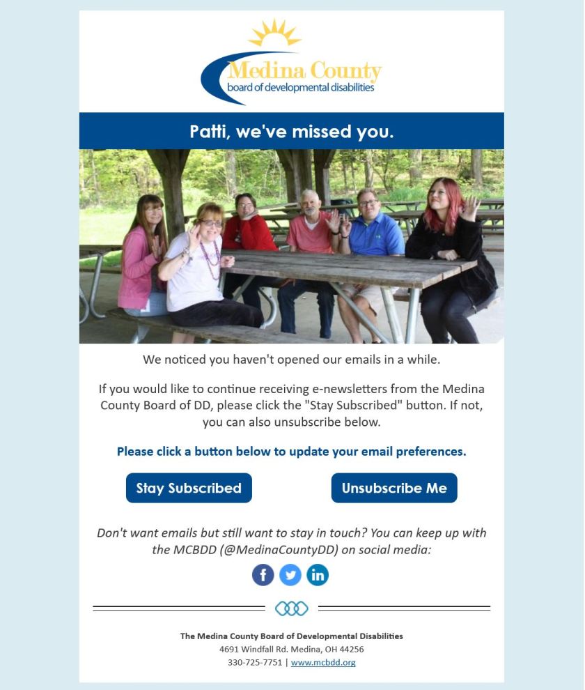 At the Medina County Board of Developmental Disabilities (MCBDD), I was responsible for managing the social media efforts. This included scheduling posts, engaging with online audiences, tracking data, and running social media campaigns. In my three years in this position, I more than doubled our followers (organically!) and maintained an average post engagement rate of 7.5%.