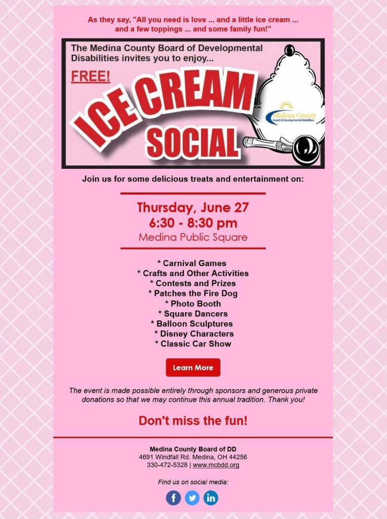 Event planning was also part of my position at MCBDD. These events included internal and external training sessions, donation drives, school events, community vendor shows, and most notably, the MCBDD’s Ice Cream Social which draws over 3,500 people annually. I oversaw committees for these events, coordinated vendors, handled event promotion, and also shot photography/video during the events.