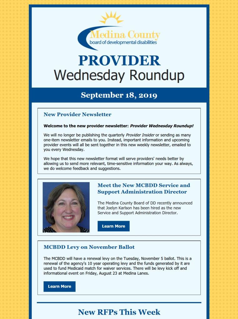 At MCBDD, I created and distributed a variety of internal and external e-newsletter publications. I managed a list of over 3,500 contacts through Constant Contact, segmented into over 25 unique lists which allowed for specific targeting.